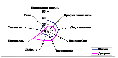 Лепестковая диаграмма является вариантом социологического профиля и позволяет сравнивать распределение признака в двух и более группах, например, сравнение необходимых качеств юношей и девушек (рис. 16).