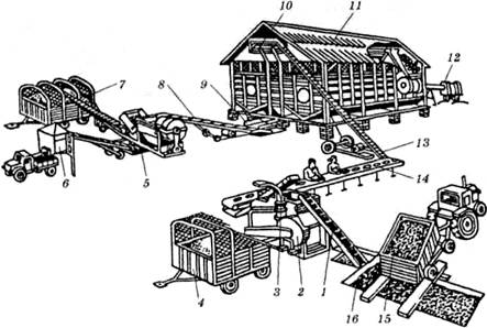 Рис. 5. Стаціонарний механізований пункт ПМУ-15 для обробки качанів кукурудзи: 1, 3, 8, 9, 10 і 13 — конвеєри; 2 — очисник качанів ОП-15С; 4, 7 і 15 — тракторні причепи; 5 — молотарка качанів; 6 — бункер для зерна; 11 — бункери з вентилюванням; 12 — теплогенератор; 14 — перебиральний стіл; 16 — приймальний бункер Скребковий конвеєр —це ланцюг зі скребками 400 мм завширшки, встановлений на опорному стояку і рамі з двома опорними колесами відповідно до висоти навантаження. У бункер-живильник транспортними засобами завантажують качани кукурудзи, а потім невеликими дозами подають їх у приймальний ківш скребкового конвеєра, який перемішує качани вгору у сховища, бункери або транспортні засоби.
