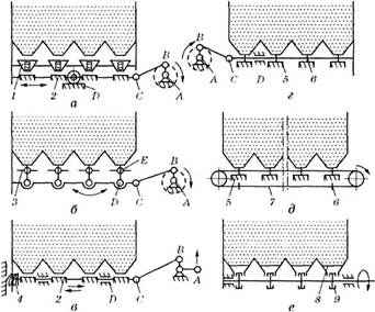 Рис. 5. Схеми розвантажувальних механізмів шахтних зерносушарок: а — з рухомою кареткою; б — з коливальними лотоками; в — з пересувними полицями; г — з коливальними скребками; д — зі стрічковим скребковим конвеєром; е — з обертальними роликами; 1 — лійка; 2 і 5 — полиці; 3 — лотоки; 4 — пружина; 6 — скребки; 7 — конвеєр; 8 — заслінка; 9 — кулачковий вал