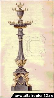 Рисунок канделябра из серо-фиолетовой яшмы. Автор проекта – архитектор Гальберг. [1827 г.] ЦХАФ АК. Ф. 1. Оп. 2. Д. 4023. Л. 7. Подлинник. Монетный двор Сузунского медеплавильного завода с 1766 по 1781 г. изготовлял сибирскую медную монету, имевшую хождение только в Сибири; с 1781 по 1847 г. – общероссийскую.