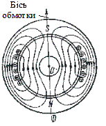 виникає магнітне поле, лінії магнітної індукції якого замикаються по тілу статора, повітряних проміжках і тілу ротора. Місце виходу ліній магнітної індукції із статора приймають за північний полюс, а місце входу їх в статор – за південний. Отже, при одній обмотці маємо поле з однією парою полюсів, як показано на рис.16.1. Якщо в пазах статора розмістити дві обмотки, вісі яких змістити на кут Лінії магнітної індукції, які охоплюють всю обмотку, зчіплюються зі всіма витками обмотки, а ті, що перетинають її, - лише з частиною витків. Тому магнітна індукція (магнітний потік на одиницю площі) на осі обмотки буде найбільшою, а перпендикулярно до неї – буде дорівнювати нулю. Оскільки опір магнітному потоку повітря і міді провідників обмотки, розташованих в пазах, великий, то магнітний потік, в основному, буде проходити між пазами і розподіл магнітної індукції у перерезі повітряного проміжку між статором і ротором буде мати ступінчастий вигляд, як показано на рис.16.2. Щоби одержати аналітичну залежність розподілу індукції по колу, ступінчастий графік можна розкласти в ряд Фурьє і розглянути першу гармоніку. Для першої гармоніки магнітна індукція в повітряному проміжку має найбільше значення