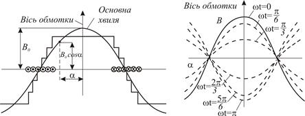 Розподіл індукції за гармонічним законом у перерізі повітряного проміжку, як показано на рис.16.2, відповідає вказаному напрямку струму в обмотці. Коли обмотку живити синосоїдною напругою, то магнітний потік, який зчеплений з нею, і магнітна індукція в будь-якій точці розточки статора також будуть змінюватися за синусоїдним законом, тобто