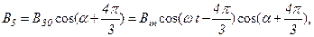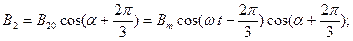 При живленні цих обмоток симетричною трифазною системою синусоїдних напруг виникають три пульсуючі магнітні поля, вісі яких також будуть зсунуті на кут На рис.16.5 показана картина розподілу магнітної індукції у повітряному проміжку у випадку, коли в першій обмотці струм максимальний. Оскільки магнітний опір повітря сталий, то при визначенні результуючої індукції у бідь-якій точці можна використати принцип накладання. Згідно з цим принципом миттєве значення результуючої індукції в у точці, зміщеній відносно вісі першої обмотки на кут a, дорівнюватиме