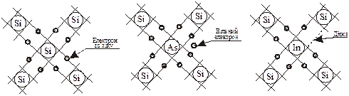 Провідність чистих (бездомішкових) напівпровідників називається власною. Вона складається з електронної провідності (провідності n-типу), зумовленої впорядкованим рухом вільних електронів, і діркової провідності (провідності р-типу), яка зв’язана з направленим переміщенням дірок. В основі направленого переміщення дірок під дією зовнішнього електричного поля лежать “перескоки” електронів від атома до атома проти напрямку поля. Цей рух відбувається з меншою швидкістю, ніж рух вільних електронів, тому рухомість дірок менша. Концентрація дірок і електронів у чистому напівпровіднику однакова. Добитись переважаючої провідності р- чи n-типу можна шляхом легування чистого напівпровідника, тобто введенням домішок атомів з іншою валентністю. Провідність легованих напівпровідників називають домішковою. Напівпровідники з переважаючою електронною провідністю називаються напівпровідниками n-типу. Електронна провідність зумовлюється домішками елементів п’ятої групи таблиці Менделєєва, які називають донорними. Механізм виникнення провідності n-типу пояснюється тим, що при заміщенні атома кремнію у вузлі решітки на п’ятиелементний атом домішки, наприклад, атом миш’яку У більшості напівпровідникових приладів використовуються властивості електронно-діркового переходу. Електронно-дірковим переходом називають вузьку (декілька мікронів) область, збіднену вільними носіями, яка виникає на межі областей з різним типом провідності. Виникнення р-n переходу зумовлено градієнтом концентрації носіїв в приграничних областях (рис.18.2, а). В результаті дифузії електрони з n-області переходять в р-область, що призводить появу нескомпенсованих додатних зарядів атомів донорної домішки в n-області та від’ємних зарядів у р-області. Аналогічно, перехід дірок з р-області в n-область викликає появу від’ємних зарядів атомів акцепторної домішки в р-області і додатних зарядів в n-області. Таким чином на границі областей n- і р-типу виникають два шари об’ємних нерухомих зарядів - подвійний запірний шар. Електричне поле, яке створюють заряди запірного шару, протидіє подальшому руху носіїв через перехід. При цьому встановлюється динамічна рівновага: частина носіїв покидає перехід, а їх місце займає така ж кількість інших носіїв.