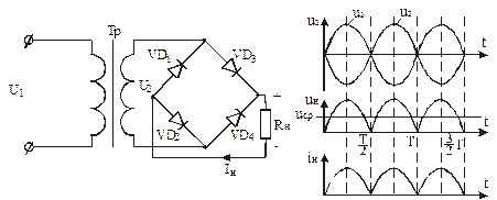 Випрямлячі поділяються на одно- і трифазні, одно- і двопівперіодні, керовані і некеровані та з множенням напруги. Схема однофазного однопівперіодного випрямляча без фільтра наведена на рис 18.5, а.