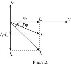 На прикладі кола, яке складається з паралельно ввімкнених котушки з індуктивністю L і активним опором R1 та конденсатора С, можна дослідити зв’язки між напругою живлення U і струмами і, і1, і С (рис. 7.1) за допомогою векторної діаграми. Побудову векторної діаграми починають з вектора напруги