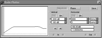Ammeter resistance – внутрішній опір амперметра; Voltmeter resistance – вхідний опір вольтметра; Ohmmeter current – струм через об'єкт, що контролюється; Decibel standard – установка еталонної напруги V1 при вимірюванні ослаблення або підсилювння в децибелах (за умовчанням V1 = 1 В). При цьому для визначення коефіцієнта передачі використовується формула: К [дБ] = 20lg (V2/V1), де V2 – напруга в точці, що контролюється. Наведемо приклад використання мультиметра в режимі dB. Передбачимо, що необхідно виміряти коефіцієнт передачі аудиопідсилювача на частоті 20 кГц. Для цього до його входу підключимо джерело змінної синусоїдальної напруги частотою 20 кГц і значенням напруги V1 = 1 В, а до виходу мультиметр. Передбачимо далі, що в режимі вимірювання напруги отримана величина вихіднї напруги V2 = 100 В. Отже, коефіцієнт передачі підсилювача К = V2/V1 = 100 В. Переведемо мультиметр в режим dB, тоді знайдемо значення коефіцієнта підсилення в децибел К[дБ] = 20lg 100 = 40 дБ. Передбачимо далі, що частота вхідного сигналу збільшена до 100 кГц і отримана напруга на виході підсилювача V2 = 0, 1 В, тобто коефіцієнт передачі в цьому випадку складає К = 0, 1/1 = 0, 1. В режимі dB мультиметр покаже К [дБ] = 20 lg 0, 1 = - 20 дБ. Відмітимо, що мультиметр вимірює ефективне (діюче) значення змінного струму. Вимірювач АЧХ та ФЧХ (Bode Plotter) Вимірювач призначений для аналізу амплитудно-частотних (при натисненій кнопці MAGNITUDE, включена за умовчанням) і фазо-частотних (при натисненій кнопці PHASE) характеристик при логарифмічній (кнопка LOG, включена за умовчанням) або лінійній (кнопка LIN) шкалі по осях Y (VERTICAL) і X (HORIZONTAL). Лицьова панель вимірювач АЧХ та ФЧХ показана на рис. 2.7. Настройка вимірювача полягає у виборі меж вимірювання коефіцієнта передачі і варіації частоти за допомогою кнопок у віконцях F(Final) максимальне і I(Initial) мінімальне значення. Значення частоти і відповідне їй значення коефіцієнта передачі або фази відображається у віконцях в правому нижньому кутку вимірювача. Значення вказаних величин в окремих точках АЧХ або ФЧХ можна отримати за допомогою вертикальної визирной лінії, що знаходиться в початковому стані на початку координат і переміщуваною по графіку мишею або кнопками, ®. Результати вимірювання можна записати також в текстовий файл. Для цього необхідно натиснути кнопку SAVE і в діалоговому вікні указати ім'я файла (за умовчанням пропонується ім'я схемного файла). У отриманому таким чином текстовому файлі з розширенням. bod АЧХ і ФЧХ представляються в табличному вигляді. Підключення приладу до схеми, що досліджується, здійснюється за допомогою затискачів IN (вхід) і OUT (вихід). Ліві затискачі підключаються відповідно до входу і виходу пристрою, що досліджується, а праві до загальної шини. До входу пристрою необхідно підключити функціональний генератор або інше джерело змінногї напруги, при цьому настроювати ці прилади не потрібно.