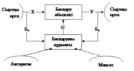 Басқ ару жү йесіне қ атысты басқ ару мақ саты мен алгоритм сыртқ ы сипатқ а ие. Ол басқ ару мақ саты мен алгоритм берілген басқ ару жү йе арқ ылы емес, басқ а одан жоғ ары дең гейдегі жү йе арқ ылы анық талуына байланысты. Сонымен, кез келген басқ ару ү рдісі тө рт аспектілерімен сипатталады: 1) объектке басқ арушы ә сер тигізілетін U арнасы; 2) басқ арушы ә серлерді синтездеу ү шін қ ажет болатын объект туралы ақ парат алынатын арналар ( 3) басқ ару мақ саты; 4) басқ ару алгоритмі. Басқ ару субъектісі – нақ тылы техникалық жү йелер, ү рдістер жә не механизмдер, тұ лғ алар, ұ жымдарды, ұ йымдарды, кә сіпорындарды, мемлекеттерді басқ ару жү йелері. Объекттер қ ойылғ ан мақ саттарғ а жетуі ү шін субъект мақ саттар немесе берілген программағ а негізделген объекттердегі басқ ару параметрлерін қ алаулы ө згерістерге ә келетін басқ ару ә серлерді жү зеге асыруы тиіс. Сонымен, басқ ару – ол бар ақ параттың негізінде белгілі бір мақ саттарғ а жетуге бағ ытталғ ан ү рдіс. Басқ ару ү рдістерін қ арастыру барысында кибернетикалық тә сіл кең пайдаланылады. Кибернетика (ежелгі грек κ υ β ε ρ ν η τ ι κ ή / kybernetike сө зінен — «басқ ару ө нері», kybernao сө зінен — «рульді басқ арамын», κ υ β ε ρ ν ή τ η ς / kybernē tē s сө зінен — «кеменің рулін ұ стап отырушы», жеке жағ дайларда бұ л сө здің тү бірінен «губернатор» немесе ағ ылшын «government» — ө кімет сө здері пайда болғ ан) — машиналар, тірі ағ залар немесе қ оғ ам сияқ ты тү рлі жү йелерде басқ ару жә не ақ парат жіберу ү рдістердің жалпы заң дылық тары туралы ғ ылым. Кибернетиканың объектісі болып барлық басқ ару жү йелері табылады. Басқ аруғ а бағ ынбайтын жү йелер негізінде кибернетиканың зерттейтін объектілер қ атарына жатпайды. Кибернетика кибернетикалық тә сіл, кибернетикалық жү йе сияқ ты ұ ғ ымдарды ендіреді. Кибернетикалық жү йелер олардың материалдық табиғ атына тә уелсіз абстрактілі тү рде қ арастырылады. Кибернетикалық жү йелердің мысалдары – техникадағ ы автоматты реттегіштер, ЭЕМ (ДК), адамның миі, биологиялық популяциялар, адам қ оғ амы. Мұ ндай ә р жү йе ақ паратты қ абылдауғ а, есте сақ тауғ а, ө ндеу жә не алмасуғ а қ абілетті ө зара байланысқ ан объекттердің (жү йе элементтерінің) жиыны болып табылады. Кибернетика басқ ару жү йелерін жә не ой ең бегін автоматтандыру жү йелерін қ ұ рудың жалпы қ ағ идаларын жетілдіреді. Кибернетика мә селелерін шешуге арналғ ан негізгі техникалық қ ұ ралдар — тү рлі есептеуіш қ ұ рылғ ылар, ДК. Сондық тан, кибернетиканың жеке ғ ылым ретінде пайда болуы (Н. Винер, 1948) XX-шы ғ асырдың 40-шы жылдары сондай машиналардың қ ұ рылуына байланысты, ал кибернетиканың теориялы жә не практикалық аспекттері тұ рғ ысында дамуы - электронды есептеуіш техниканың прогресіне байланысты. Автоматтандыру — ғ ылыми-техникалық прогресс бағ ыттарының бірі, энергия, материалдарды немесе ақ паратты алу, тү рлендіру, жіберу жә не пайдалану ү рдістеріне қ атысудан адамды босаттатын, осындай қ атысу дә режесін немесе орындалатын операциялардың ең бексыйымдылығ ын елеулі тү рде азайтатын ө зін ө зі реттеуші техникалық қ ұ ралдар, экономика-математикалық ә дістер жә не басқ ару жү йелерін пайдалану. Электронды техниканы жә не есептеу ә дістерін қ олданатын, кейде адамның ойлау функцияларын жү зеге асыратын, ақ паратты алу кө здерін (сезгіш қ ұ ралдарды, сенсорларларды), енгізу қ ұ рылғ ыларын, басқ ару қ ұ рылғ ыларын (