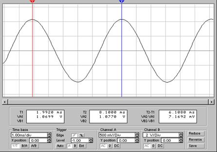 3.5 Введений конденсатор надає можливість управління взаємодією коливального контуру з транзисторним каскадом і називається конденсатором зв’язку. Осцилограма сигналу тепер значно поліпшилась (рис.3.4). Це підтверджує те, що спочатку підсилювальний каскад було перевантажено. 3.6 Як бачимо з рисунку, період коливань дорівнює 6, 1 мс, тобто він майже співпадає з теоретично розрахованим (за формулою 1.11), який дорівнює 6, 28 мс.