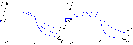 Фільтри Чебишева. Ці фільтри забезпечують найбільшу крутизну АЧХ в перехідній смузі частот. Але АЧХ в смузі пропускання має коливальний характер. АЧХ фільтра Чебишева (рис. 1. 2, б) описується виразом: