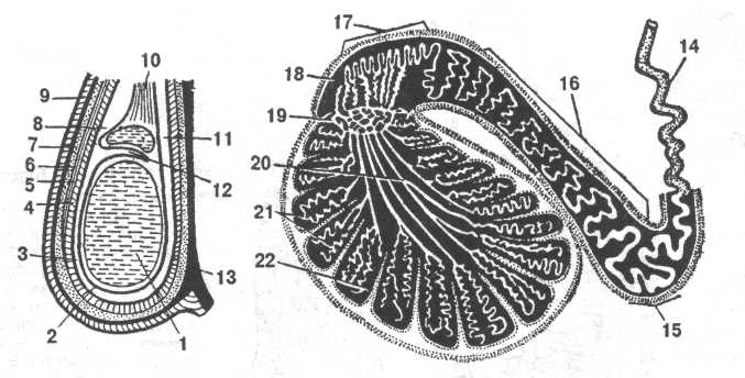 1 — сім'яник; 2 — спеціальна піхвова оболонка сім'яника; 3 — піхвова порожнина; 4 — загальна піхвова оболонка сім'яника; 5 — зовнішній піднімач сім'яника; 6 — фасція піднімача; 7 — м'язова оболонка мошонки; 8 — піхвова порожнина; 9 — шкіра мошонки; 10 — сім'яний канатик; 11 - піхвова порожнина; 12 — синус придатка; 13 — перегородка мошонки; 14 — сім'япровід; 15 — хвіст, 16 — тіло, 17 — голівка придатка; 18 - вивідні канальці; 19 — сітка сім'яника; 20 — прямі й 21 — звивисті канальці; 22 — сполучнотканинні перегородки За м'язово-еластичною оболонкою йде м'яз — зовнішній піднімач сім'яника з поперечносмугастої м'язової тканини (гілка від внутрішнього косого черевного м'яза). Він добре розвинений у жеребця та кролів. Загальна піхвова оболонка складається з двох шарів: зовнішнього — фіброзного — з щільної сполучної тканини та внутрішнього — серозного — з одношарового плоского епітелію. 3. Будова сім’яного канатика, сімяпроводу, сечостатевого каналу. Сім'яний канатик (funiculus spermaticus) — це тяж, що розміщується в паховому каналі. Основа його починається від сім'яника і придатка сім'яника, а вершина досягає внутрішнього пахового кільця. Сім'яний канатик складається з сім'япроводу, нервів, внутрішніх сім'яникових артерій і вен, внутрішнього піднімача сім'яника, лімфатичних судин. Ззовні оточені спеціальною піхвовою оболонкою. Сім'япровід (ductus deferens) — довга вузька трубка, яка починається від хвоста придатка сім'яника, піднімається вгору в складі сім'яного канатика і проходить через паховий канал у черевну порожнину. Потім спрямовується в тазову порожнину до сечового міхура і відкривається в сечовивідний канал, який після цього стає сечостатевим каналом. Кінцевий відділ сім'япроводу в жеребця, бугая і барана має ампулоподібне розширення, в стінці якого є пристінкові залози, що виробляють секрет. Стінка сім'япроводу складається зі слизової, м'язової та серозної оболонок. Слизова оболонка вистелена одношаровим багаторядним миготливим епітелієм. М'язова оболонка побудована з гладенької м'язової тканини, забезпечує переміщення сперматозоонів по сім'япроводу. Сечостатевий канал або чоловіча уретра, — трубка, по якій виводяться назовні сеча із сечового міхура і сперма із сім'яника, придатка сім'яника та придаткових статевих залоз. Починається з місця впадіння в нього сім'япроводів, потім в стінці статевого члена і закінчується отвором на його голівці. Розрізняють тазову і статевочленну частини сечостатевого каналу. Остання частина лежить між правою та лівою половинами печеристого тіла статевого члена.