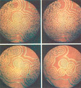 Рис.2 Некоторые конфигурации, возникающие при реакции Белоусова — Жаботинского в тонком слое в чашке Петри Однако осознание того, что макроскопическая когерентность является фундаментальным свойством, пришло лишь недавно. Это связано с двумя обстоятельствами. Во-первых, в когерентных режимах можно ожидать увеличения выходов реакции, селективности процессов, самоочистки поверхностей от каталитических ядов и т. п. Во-вторых, интерес к химическим осцилляторам проявился вновь благодаря биохимическим осциллирующим процессам в нервных клетках, мышцах, митохондриях. Считается, что система химических осцилляторов является прообразом будущих моделей нейронных сетей. Современная химия, раздвигая свои горизонты, активно вторгается в области, которые для «классической» химии не представляли интереса или были недостижимы. Особенно впечатляющие результаты достигнуты в области фемтохимии, которая развивается благодаря прогрессу в получении ультракоротких (10-14 - 10-15с) лазерных импульсов. Эти импульсы позволяют эффективно воздействовать на отдельные атомы и молекулы вещества, обеспечивая высочайшее пространственно-временное разрешение в управлении химическими превращениями. Мощные лазерные импульсы — великолепное средство генерации коротких ударных волн, стимулирующих экзотические химические превращения (например, синтез металлического водорода). Другим направлением создания экзотических условий является лазерное охлаждение до сверхнизких температур (10-4 - 10-6К), с помощью которого, например, удалось получить новое состояние вещества — кристаллический газ.