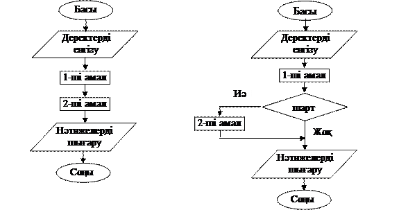 Сурет 4.2 – Сызық ты жә не тармақ талу алгоритмдерінің блок-схема мысалдары Кө п рет орындалу ү шін арналғ ан нұ сқ аулар тізбегі, цикл тұ лғ асы деп аталады. Цикл тұ лғ асының бір рет орындалуы итерация деп аталады. Кезекті мә рте итерация орындалатындығ ын немесе цикл аяқ талатындығ ын анық тайтын ө рнек шығ у шарты немесе цикл аяқ талу шарты деп аталады (немесе оның ақ ихаттығ ының интерпретациялануына тә уелді– циклді аяқ тау немесе жалғ астыру қ ажеттілігі белгісі ретінде жалғ астыру шарты деп аталады). Итерацияның ағ ымдағ ы нө мірін сақ тайтын айнымалы цикл итерацияларын санауыш немесе жай цикл санауышы деп аталады. Циклдың санауышты қ амтуы міндетті емес, санауыштың жалғ ыз болуы міндетті емес – циклден шығ у шарты цикл ішінде ө згеретін бірнеше айнымалыларғ а тә уелді болуы мү мкін, немесе сыртқ ы шарттар арқ ылы анық талуы мү мкін (мысалы, белгілі бір уақ ыттың басталуына), соң ғ ы жағ дайда санауыш мү лдем қ ажет болмауы да мү мкін. Кез келген циклды орындау цикл айнымалыларын бастапқ ы инициализациялауды, шығ у шартын тексеруді, цикл тұ лғ асын орындауды жә не ә р итерацияда цикл айнымалысын жаң артуды қ амтиды. Сонымен қ атар, программалау тілдерінің кө бісі циклді мезгілден бұ рын аяқ тау, яғ ни шығ у шартының ақ ихаттылығ ына тә уелсіз циклден шығ у қ ұ ралдарын ұ сынады.