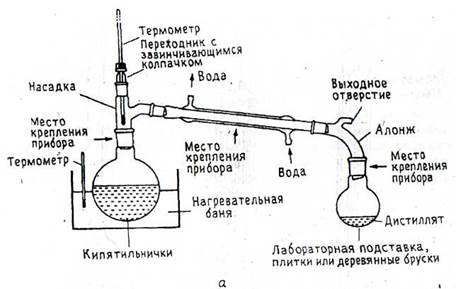 Холодильник с приемной колбой соединяют переходником, называемым алонжем (рис.6а). Алонж обязательно должен сообщаться с атмосферой. В случаях, когда ведут перегонку органических соединений для которых контакт с влагой нежелателен, к отводному отверстию алонжа присоединяют осушительную трубку (рис.6б). Перегонную колбу помещают в нагревательную баню. Это обеспечивает равномерность нагрева и позволяет избежать перегрева. В качестве теплоносителя могут быть использованы воздух, вода, сплав Вуда и др. Выбор теплоносителя определяется природой перегоняемых соединений. Водяные бани используют для перегонки органических жидкостей с температурой кипения до 80°С. Категорически запрещается использовать водяные бани при нагревании колб, содержащих металлический натрий, калий. Для перегонки жидкостей с температурой кипения свыше 80°С используют масляные бани, содержащие нефтяные или силиконовые масла, а свыше 250 и до 350°С - баню из сплава Вуда.