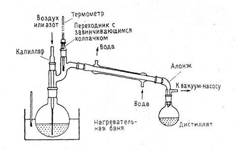 При перегонке в высоком вакууме все составные части перегонного прибора должны быть тщательно смазаны вакуумной смазкой. Нагрев бани при вакуумной перегонке включают только после достижения необходимого давления. По окончании перегонки выключают плитку, дают перегонному прибору остыть и с помощью крана вакуумированную систему изолируют от насоса. Далее снимают вакуум в приборе и закрывают водяной кран (если пользовались водоструйным насосом) и отключают насос (если использовали масляный насос). Внезапный впуск воздуха в нагретый прибор может привести к взрыву смеси паров перегоняемого вещества с воздухом.