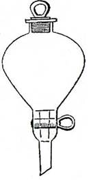 Экстракцию используют для выделения вещества из сложной смеси в результате того, что данное вещество растворяется в растворителе, а другие присутствующие вещества - нет. Экстракцию проводят в делительной воронке, представляющей собой цилиндрический или грушевидный толстостенный сосуд с краном внизу и пришлифованной пробкой сверху (рис.12). Размер ее подбирают таким образом, чтобы он был заполнен не более чем на 2/3 объема.