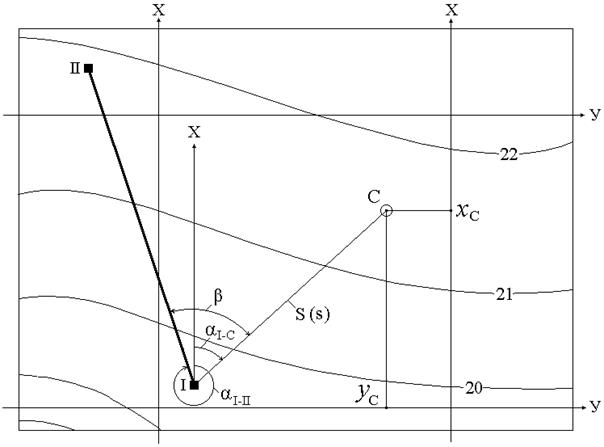 Вынос скважины производится полярным способом, т. е. в точке I (рисунок 3.4) устанавливается теодолит, совмещаются нули лимба и алидады и винтами лимба труба наводится на точку II. Открепляется алидада и труба поворачивается на отсчет по горизонтальному кругу, соответствующий углу β. По линии визирования откладывается наклонное расстояние S и забивается колышек. Таким образом, для решения вопроса о выносе скважины с проекта в натуру необходимо на местности: а) рассчитать и построить горизонтальный угол β; б) рассчитать и отложить наклонное расстояние S. На плане указывается местоположение скважины C и определяются ее координаты xC и yC. Горизонтальный угол β (см. рисунок 4.1) вычисляется по формуле β = 360˚ – α I-II + α I-C, где α I-II – дирекционный угол линии I – II; α I-C – дирекционный угол линии I – С.