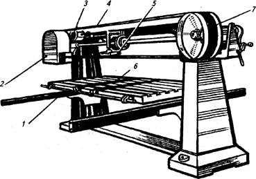 Четырехсторонний строгальный станок С-16: 1 — станина, 2 — нижняя ножевая головка, 3 — верхняя ножевая головка, 4 — маховичок подъема верхних вальцов, 5 •- вальцы, 6 — кнопочное управление, 7 — левый вертикальный шпиндель