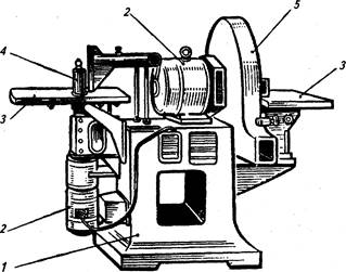 Дисковый шлифовальный станок: 1 — станина; 2 — электродвигатель; 3 — рабочий стол; 4 — бобина; Диск