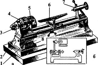 Токарный станок для обработки древесины ТД-120: а — общий вид: 1 — направляющая станины; 2 — передняя бабка, 3 — шпиндель, 4 — ременная передача, 5 — электродвигатель, 6 — подручник, 7 — задняя бабка, 8 — кнопки «пуск» и «стоп»;