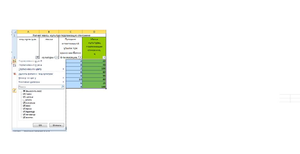 При выполнении фильтрации (выборки) данных так же, как и в случае сортировки, данные изменяются, поэтому аналогично создала новый лист «Выборка» и в нем вставила копию таблицы 1. Для фильтрации данных курсор установила в ячейке А16 и выбрала в меню команду Данные/Фильтр/Автофильтр. На верхних ячейках выделенной таблицы появились значки