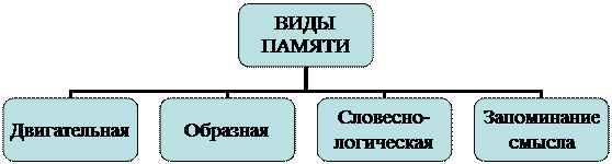 Двигательная (моторная) память проявляется в запоминании и воспроизведении движений и их систем. Она лежит в основе выработки и формирования двигательных навыков. Двигательная память позволяет, например, пианисту играть в полной темноте. Образная память – это запоминание, сохранение и воспроизведение предметов и явлений действительности. Различают подвиды образной памяти – зрительную, слуховую, осязательную, обонятельную и вкусовую. Зрительная и слуховая отчетливо проявляются у всех людей, а развитие остальных подвидов образной памяти связанно с различными видами профессиональной деятельности. Высокого развития достигает образная память у людей, занимающихся искусством. Некоторые художники могут рисовать портреты по памяти. Композиторы Моцарт, Рахманинов могли запомнить сложное музыкальное произведение, прослушав его всего один раз. Точность воспроизведения, т.е. соответствие образа оригиналу, зависит от участия речи при запоминании. Словесно-логическая память выражается в запоминании, сохранении и воспроизведении мыслей, понятий, формулировок. Мысли не существуют вне речи, вне тех или иных слов и выражений. По этому и вид памяти называют не просто логическим, а словесно-логическим. Он специфически человеческий.