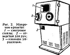 | Один из лучших фиксаторов, используемый в электронномикроскопич. исследованиях, — р-р четырёхокиси осмия. При применении медленно проникающих фиксаторов (четырёхокись осмия, глютаральдегид) толщина кусочков тканей должна быть не более 2 мм. Наилучшие результаты даётотносительно длительная фиксация при t 2—4 °С. Обызвествлённые ткани и структуры после фиксации подвергают декальцинации - обработке к-тами (азотной, соляной и др.) или электрич. током. По окончании фиксации кусочки промывают в воде или спирте. Дальнейшая обработка заключается в придании кусочкам однородной плотной консистенции, что необходимо для получения тонких срезов. Это достигается либо путём замораживания кусочков, либо путём пропитывания — заливки их различными застывающими средами. При изготовлении срезов на замораживающем микротоме (рис. 1) замораживание объектов достигается либо жидкой углекислотой, либо с помощью термоэлектрич. охлаждающего столика ТОС. В микротоме-криостате МК-25 (рис. 2) имеется камера с низкой темп-рой, в к-рую заключён микротом.
