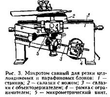 | Из сред для заливки чаще применяют парафин и целлоидин.При заливке в парафин отмытую от фиксатора ткань обезвоживают (через спирты возрастающей крепости), проводят через промежуточный растворитель (ксилол или хлороформ) и пропитывают парафином при t 55—56°С, затем, быстро охлаждая кусочки, получают парафиновые блоки. При заливке в целлоидин промежуточным растворителем является спирт — эфир (1: 1). Для получения срезов с парафиновых и целлоидиновых блоков используют санный микротом (рис. 3). Окрашиванием срезов достигают контрастирования различных структур клеток и тканей, по-разному воспринимающих те или иные красители.