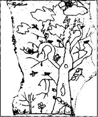Такое завершение арт-терапевтической сессии больше подходит для старших школьников, студентов и взрослых. В работе с младшими школьниками интересен следующий вариант заключительного этапа занятия. Можно прикрепить рисунки деревьев к листу ватмана или бархатной бумаги, фланели, создать фон, оставить «лес» в классе и несколько дней (недель) поиграть с ним. Например, перемещать нарисованные деревья в зависимости от настроения, «поселить» игрушечных птиц, животных, устраивать приятные сюрпризы, особенно около работ отвергаемых детей. В этом случае арт-терапевтический процесс продолжается и в период между специальными занятиями. В качестве иллюстрации приведу пример, когда на рисунок мальчика, который тяжело переживал потерю родителей, дети прикрепили небольшое «гнездо» из ниток, в которое незаметно подкладывали конфетки. Позже подобные подарки стали возникать и около других деревьев. Часто в историях «от лица» дерева, участники открыто идентифицируют себя с изображением на рисунке. Причем это явление характерно для всех возрастных групп. Из рассказов третьеклассников: «Я — засохшее дерево. Мне очень одиноко». «Около домика нарисованы цветы. Вот этот тюльпан — я, а рядом мой братишка. Его собирается сорвать садовник для букета». «Наверное, это кот. Его все любят, гладят, вкусно кормят. Нет, пусть лучше это буду я». «Я — береза, укрытая снегом. Мечтаю, чтобы зимой деревья не умирали...> >. А вот подобные, созвучные детским, высказывания студентов: «Я — фантастическое дерево». «Мне — иве очень больно». «У моего дерева много проблем. Его никто не любит». Психологу надо быть особенно внимательным и корректным к авторам необычных работ. К примеру, рисунок черного дерева с дуплами, отмирающими ветками, которые съедали черви. На фоне черного солнца — зигзаги молний. (См. рис. 13, 14. Оба автора — девятилетние мальчики из обычного класса возрастной нормы). Или изображение красной елки, которая, по словам автора, охвачена пламенем. Другая «ель» темно-синего цвета, нарисованная исключительно прямыми линиями, символизировала погибшее в пожаре растение, у которого все-таки есть надежда на возрождение. Встречаются рисунки больных или искалеченных (человеком, молнией, стихией) деревьев. Иногда вместо дерева рисуют пень с отростками, низкорослый кустар-