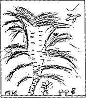 Рис. 27 Скучное дерево В пустыне жило дерево, а рядом с ним рос кустик. Кустик смеялся над деревом, и оно засохло. Тогда кустик понял, что остался совсем один. А одному так трудно жить на свете. (Рис. 28. Автор тот же. 1999 г.).