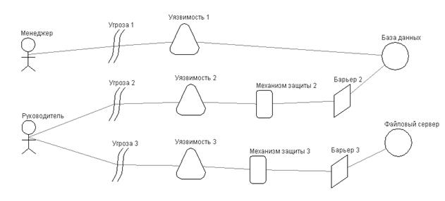 В качестве примера рассмотрим упрощенную информационную систему предприятия. В результате ознакомления с информационной системой выделены ресурсы: · база данных предприятия, содержащая данные о клиентах, заказах, хозяйственных операциях и др.; · файловый сервер предприятия, предназначенный для хранения и обмена конфиденциальной информацией. Анализ пользователей системы показал разделение всего персонала на 2 вида: · менеджеры; · управляющий персонал (руководитель, главный бухгалтер). Доступ к файловому серверу необходим только управляющему персоналу, причем следует учесть возможность обращения руководителя к ресурсам база данных и файловый сервер через общедоступные глобальные сети. Доступ менеджеров к базе данных осуществляется только внутри локальной сети предприятия. При доступе субъектов менеджер и руководитель к ресурсам системы благодаря существованию разнообразных уязвимостей в программном и аппаратном обеспечении существует возможность реализации угроз нарушения доступа.