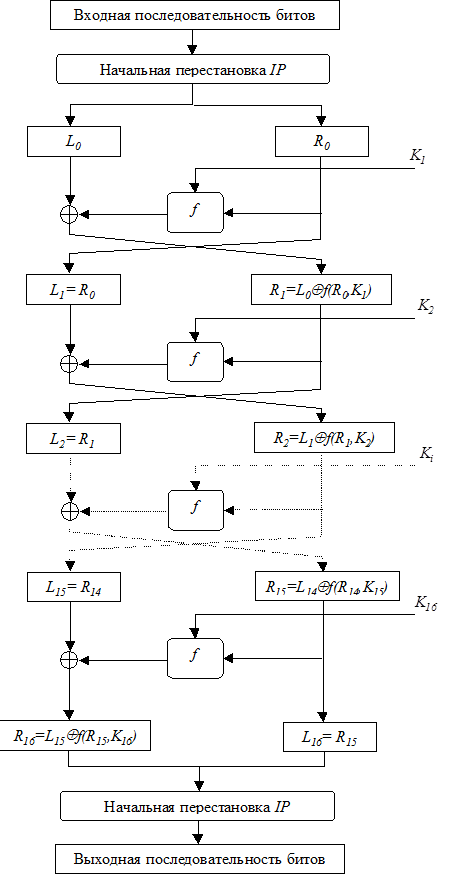 Биты входного блока T (64 бита) переставляются в соответствии с матрицей IP: бит 58 входного блока Т становится битом 1, бит 50 — битом 2 и т. д.. Эту перестановку можно описать выражением Т0=IP(T). Полученная последовательность битов Т0 разделяется на 2 последовательности: L0 — левые или старшие биты, R0 — правые или младшие биты, каждые из которых содержат 32 бита. Затем выполняется итеративный процесс шифрования, состоящий из 16 шагов (циклов). Пусть Тi — результат i-той операции: Тi= LiRi, где Li=t1t2…t32 (первые 32 бита), Ri=t33t34…t64 (последние 32 бита). Тогда результат i-той операции описывается следующими формулами: