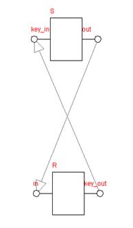 При взаимодействии элементов Приёмник и Источник выполняется передача данных как от Приёмника к Источнику так и в обратную сторону. Приёмник моделируется в виде процесса R, Источник — в виде процесса S. Процесс R генерирует пару ключей: открытый ключ и секретный ключ, затем открытый ключ передается процессу S в незашифрованном виде. После получения открытого ключа процесс S выполняет шифрование исходного сообщения и его отправку процессу R. При получении шифротекста процессом R выполняется дешифрование сообщения с помощью секретного ключа.