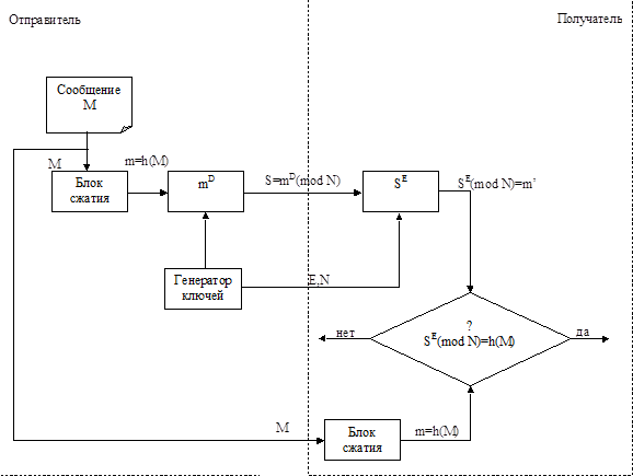 Обобщенная схема формирования и проверки цифровой подписи RSA показана на рисунке 7.1.1.