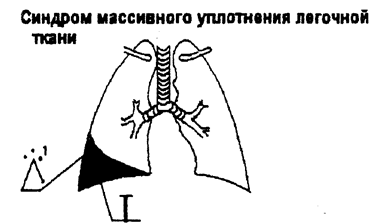 Рис. 20. Схема синдрома массивного уплотнения легочной ткани. Синдром массивного уплотнения легочной ткани является ведущим при крупозной пневмонии, а также при инфарктной пневмонии. Но в последнем случае мокрота не имеет характера «ржавой», а содержит примесь крови.