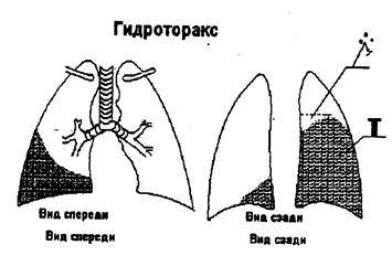 Рис. 25. Схема синдрома гидроторакса. Синдром гидроторакса является ведущим при экссудативном плеврите инфекционного или паразитарного происхождения, при иммунно-воспалительных заболеваниях (коллагенозы, саркоидоз, синдром Дресслера и др.), при опухолях, а так же при транссудатах различного происхождения: гемодинамическом - при недостаточности кровообращения, при гипопротеинемии вследствие снижения онкотического давления крови и других более редких состояниях.