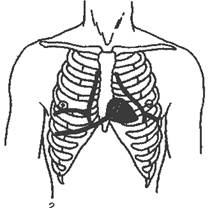 Рис. 2. Границы абсолютной и относительной сердечной тупости (абсолютная сердечная тупость заштрихована).