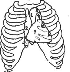 В нормеграницы абсолютной сердечной тупости расположены: Правая - проходит по левому краю грудины в IV межреберье. Левая - на 1-2 см кнутри от левой границы относительной тупости сердца в V межреберье. Верхняя - на 1 см кнаружи от левой грудинной линии на уровне IV ребра. Определение конфигурации сердца Она может быть нормальной (неизмененной), митральной, аортальной, треугольной (или трапециевидной) и смешанная. " Нормальная" конфигурация сердца (рис. 3). Правый контур состоит из двух дуг. Первая образована верхней полой веной и расположена в первом межреберье и направлена вертикально вниз вдоль правого края грудины или на 0, 5 см кнаружи от него до верхнего края третьего ребра.