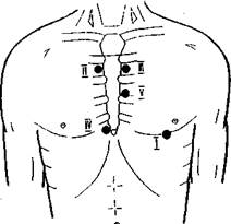 Рис. 7. Места наилучшего выслушивания работы клапанов сердца.