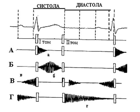 Рис. 14. Соотношение тонов и шумов сердца. а, б систолический шум: а – убывающий, б – нарастающе-убывающий; протосистолический; в, г диастолический: в – пресистолический, г – протодиастолический.