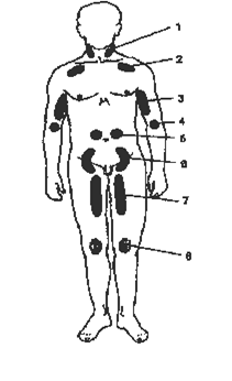 Рис. 21. Области выслушивания систолических шумов над крупными артериями (1 - сонная; 2 - подключичная; 3 - плечевая; 4 - лучевая; 5 - почечная; 6 - подвздошная; 7 - бедренная; 8 - подколенная (в подколенной ямке). Аускультация вен В норме тоны и шумы над венами не выслушиваются. При анемиях выслушивается шум волчка - непрерывный дующий или жужжащий шум над яремными венами, связанный с ускорением кровотока при снижении вязкости крови.