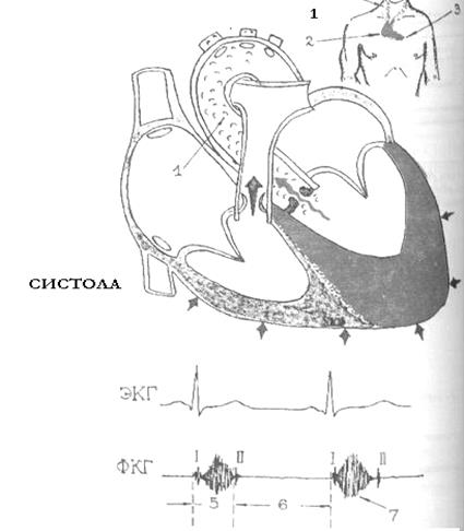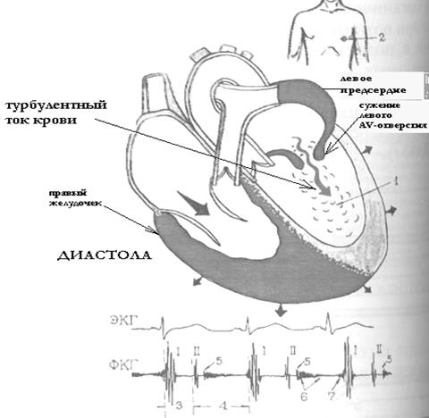 Рис. 26. Органичский шум при стенозе левого AV-отверстия (1-турбулентный ток крови; 2-локализация шума; 3-систола; 4- диастола; 5-тон открытия митрального клапана; 6-убывающий диастолический шум, отстоящий от второго тона; 7- пресистолическое усиление диастолического шума)