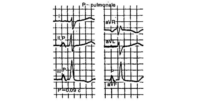 Дилатация правого предсердия 1. Высокие остроконечные зубцы Р с амплитудой > 2, 5 мм в отведениях II, III, aVF (" P-pulmonale"); в отведении V1 - преобладание первой положительной фазы двухфазного зубца Р 2. Продолжительность зубца Р не превышает норму - 0, 10", т.к. деполяризация обоих предсердий заканчивается одновременно (в норме деполяризация правого - раньше) и общая продолжительность Р не изменяется (рис.21)