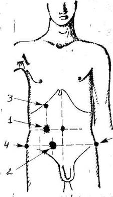 Информацию о наличии воспалительного процесса в мочевыделительной системе дает пальпация мочеточниковых точек. Информацию о наличии воспалительного процесса в мочевыделительной системе дает пальпация мочеточниковых точек. Спереди определяют болезненность в двух точках: · Верхняя мочеточниковая точка (1)– находится на пересечении вертикальной линии, проходящей по наружному краю прямой мышцы живота (3) и горизонтальной линией проходящей через пупок. · Средняя мочеточниковая точка (2) – находится на трети расстояния от передней срединной линии до spina iliaca anterior superior На задней поверхности грудной клетки и в области поясницы располагаются еще две болевые точки: · Реберно – позвоночная (5) - точка локализуется в углу, образованном XII · Реберно-поясничная (6) - находится в месте пересечения XII ребра и поясничной мышцы.