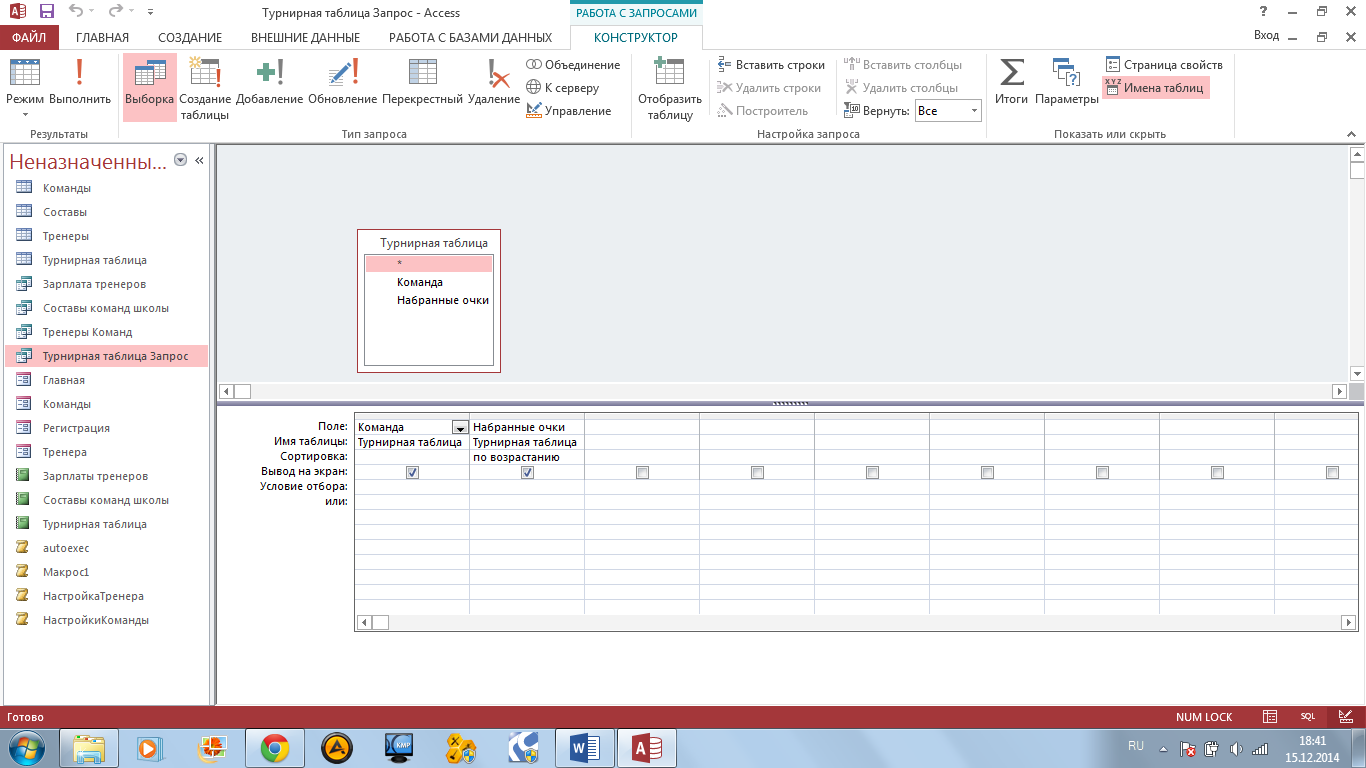 Рис.18. «Тренеры команд» Запрос «Турнирная таблица» (рис.19) относится к запросам с параметром. Данный запрос выводит информацию о количестве набранных очков каждой из команд и фильтрует их по возрастанию.
