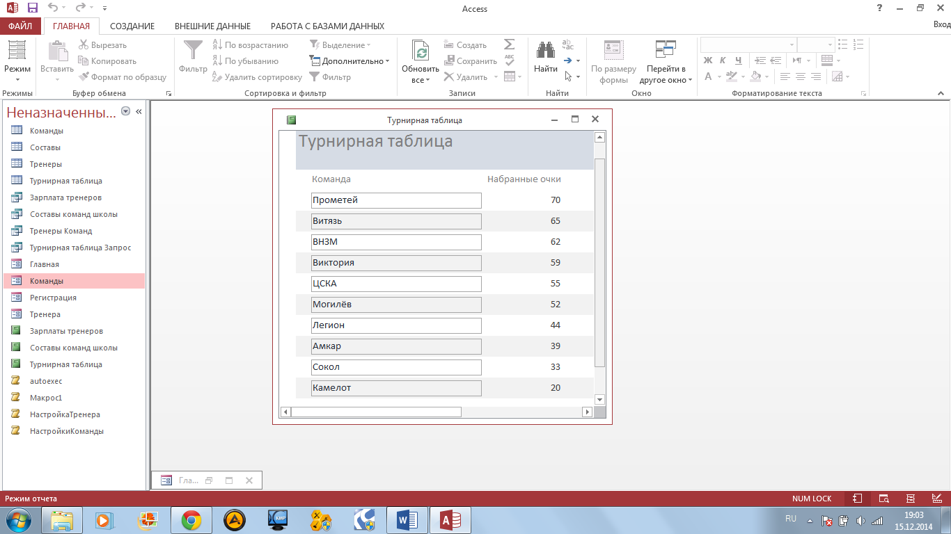 Рис.19. «Турнирная таблица» Отчеты Отчет «турнирная таблица» (рис.20) выводит на экран количество очков, набранных каждой из команд.