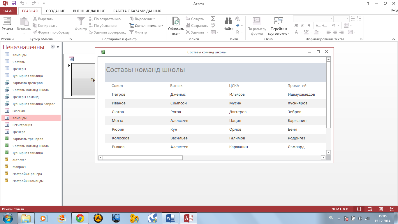 Рис.21. Отчет «составы команд». Заключение Использование баз данных и информационных систем становится неотъемлемой составляющей деловой деятельности современного человека и функционирования преуспевающих организаций. В связи с этим большую актуальность приобретает освоение принципа построения и эффективного применения соответствующих технологий и программных продуктов. Современные информационные системы (ИС), реализующие интеграцию данных, характеризуются огромными объемами хранимых данных, сложной организацией, необходимостью удовлетворять разнообразные требования многочисленных пользователей. Цель информационной системы - обработка данных об объектах реального мира. В широком смысле база данных - это совокупность сведений о конкретных объектах реального мира в какой-либо предметной области. Под предметной областьюпринято понимать часть реального мира, подлежащего изучению. Создавая базу данных, пользователь стремится упорядочить информацию по различным признакам и быстро извлекать выборку с произвольным сочетанием признаков. Это возможно сделать, если данные структурированы. Задачами курсовой работы были: · Эффективное изложение информации. · Обеспечение доступа к информации. · Проверка на подлинность информации. · Предотвращение возможных ошибок в доступе базы данных. · Открытый доступ только к той информации, которая необходима для работы. · Открытая возможность редактирования информации только проверенным людям. · Упрощенный способ для редактирования информации, а также для предоставления отчетности.