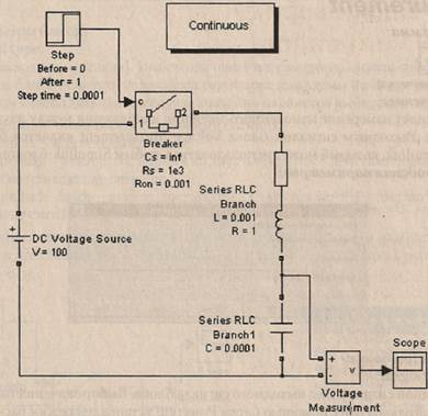 .Параметры блока: Оutput signal: [Выходной сигнал]. Вид выходного сигнала блока. Выбор значения параметра возможен, только если с помощью блока Powergui установлен режим расчета схемы комплексным методом (Рлазог simulation). В этом случае значение параметра выбирается из списка: ~ Magnitude - амплитуда (скалярный сигнал); ~ Complex - комлексный сигнал; ~ Real- Imag - вектор, состоящий из двух элементов - действительная и мнимая составляющие сигнала; ~ Magnitude- Angle - вектор, состоящий из двух элементов - амплитуда и аргумент сигнала. Положительное направление напряжения задается знаками «+»и «-»на пиктограмме блока. Знак напряжения считается положительным, если напряжение направлено от клеммы «+»к клемме «-». Пример: На рис. 3.11 показана схема, в которой блок Voltage Measurement используется для измерения напряжения на конденсаторе последовательного колебательного контура. Simulink-сигнал, формируемый данным блоком, используется затем для отображения напряжения на осциллографе. Нулевые начальные условия для расчета схемы задаются в окне параметров блока Series RLC Branch.