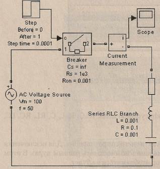 ~ Branch current - ток цепи; ~ Branch voltage and current - напряжение и ток цепи. Отображаемым сигналам в блоке Multimeter присваиваются метки: ~ Ib - ток цепи; ~ Ub - напряжение цепи. Пример: На рис. 3.15 показана схема с использованием последовательного колебательного контура. На схеме источник переменного напряжения амплитудой 100 В и частотой 50 Гц подключается к цепи с параметрами: R = 0, 1 Ом, L = 0, 001 Гн и С = 0, 001 Ф.