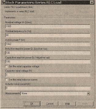 Назначение: Блок Series RLC Load моделирует последовательное включение резистора, индуктивности и конденсатора. Параметры цепи задаются через мощность цепи при номинальном напряжении и частоте. Окно задания параметров: